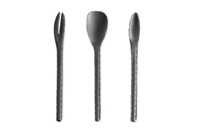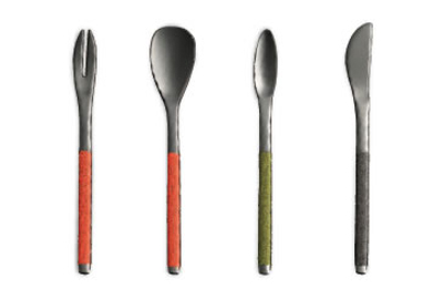 硬質な墨のボディーに、乾漆を思わせる織目の風合い。布地巻きの技術を用いた今までにないカトラリーシリーズです。日本の伝統色から朱・抹茶・漆黒の3色をご用意しました。くつろぎのデザートタイムをお楽しみください。