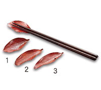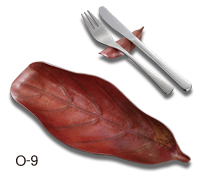 | 銅製 新箸置1 かき 60×28mm2 びわ 70×25mm3 けやき(虫くい) 75×25mm | O-9 銅ナイフレスト 木の葉90×25mm※フォーク、ナイフはイメージです。 |
