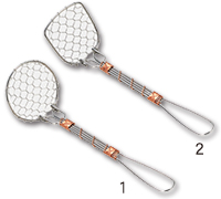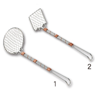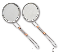卓上お玉(根来)1 穴明 直径φ70×柄長 180mm2 穴無 直径φ70×柄長 180mm 3 アク取 直径φ80×柄長 180mm | プレス銅線巻アク取り1 細目 φ80×180mm 2 荒目 φ80×180mm |